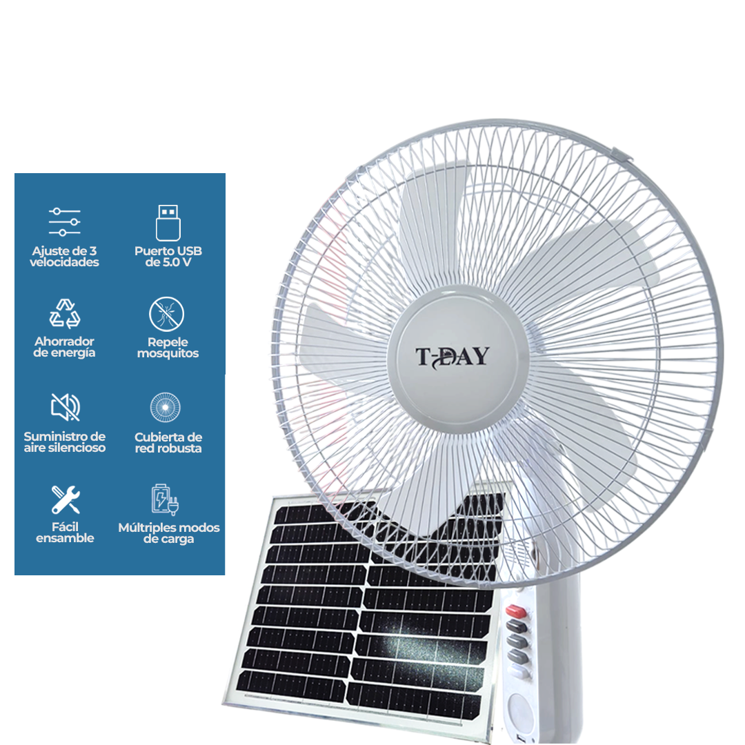 – Características especiales Puerto USB, Oscilante, Luz LED, Panel solar